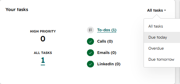The Tasks card is where most users begin working through their daily sales activities once they have reviewed the guided actions.