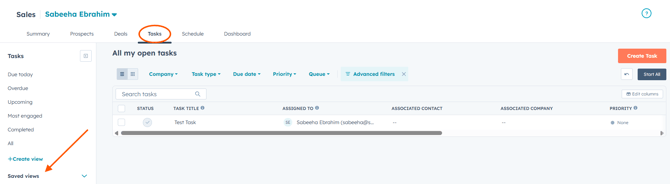 Tasks view in Sales Workspace showing open tasks and saved views