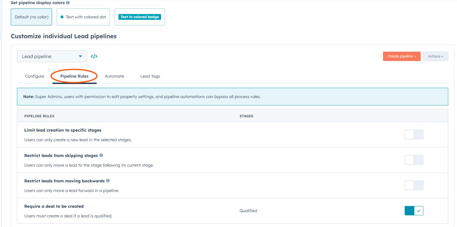 Pipeline Rules settings for controlling how leads move through the pipeline