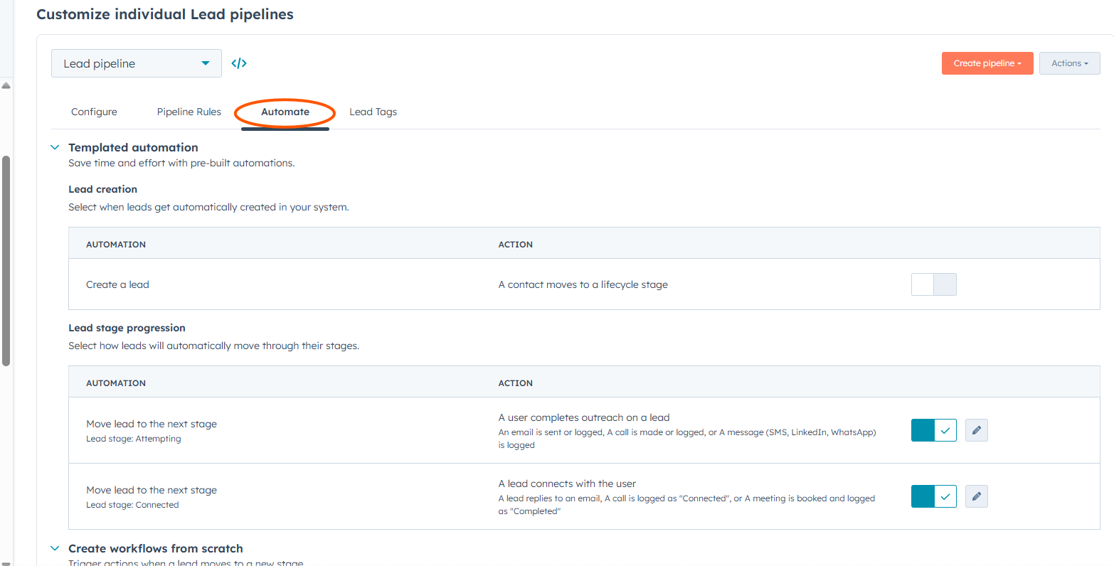 Automate tab for configuring lead creation and stage progression