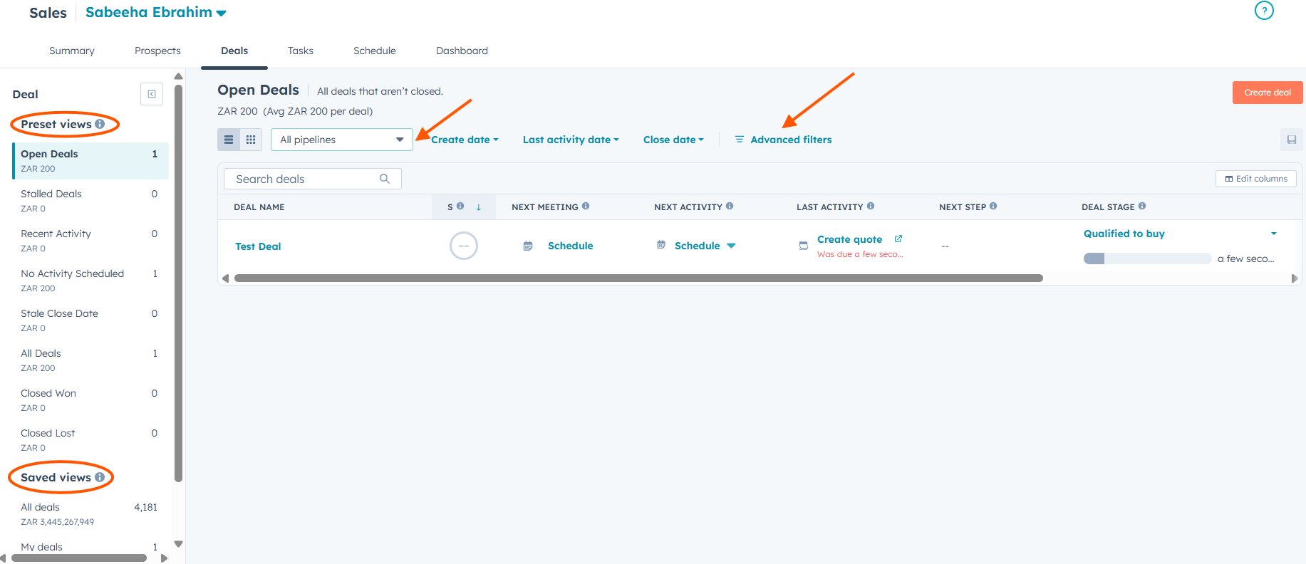 Deals tab in Sales Workspace showing preset views, saved views, pipelines and deal filters